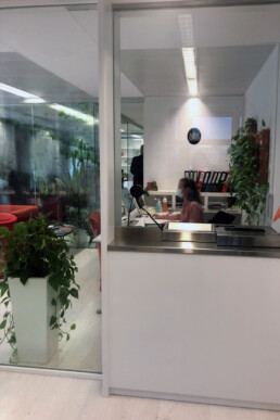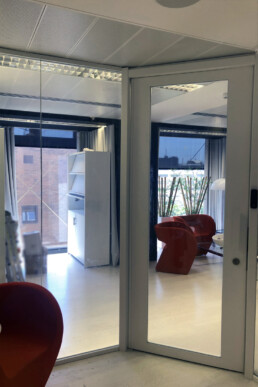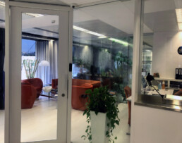 Puerta Antibala BR2 y mampara lateral con carpintería y vidrio BR2 según norma UNE EN 1063.